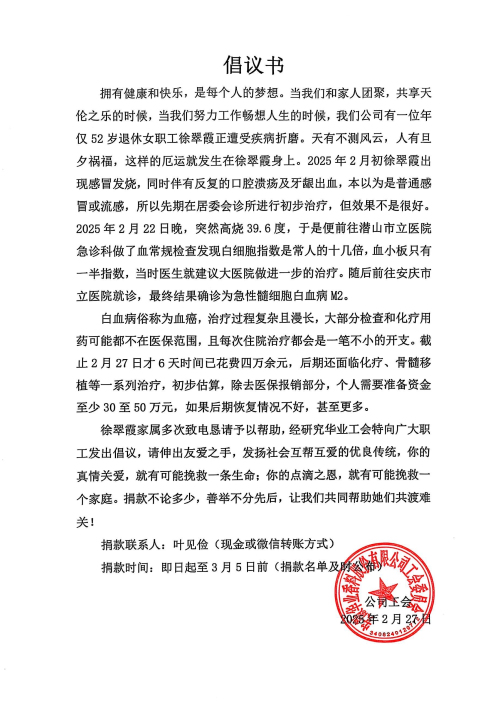 近日,太阳集团官网工会发起倡议,为退休女员工徐翠霞组织爱心捐款。公司的董事长、总经理率先垂范,慷慨解囊,全体员工积极参与,在公司群里进行爱心接力,筹集善款近5万元。