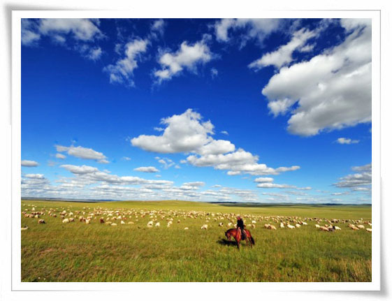 穿着一身正宗的蒙古服饰,伴着阵阵欢声笑语中,我们见到了那传说中的希拉穆仁,是的,是那样的一望无际,草原的边界与远处的天边融合在一起,天地合一,诉 说着美好的明天。再向草原深处才发现,灵澈的湛蓝似乎是被层层圈圈地抹上去的,尚带一条色彩不均匀的云尾,不知名的野花零星地点缀在漫漫青草中,平凡中带 着一丝高雅,深呼吸,空气清新,远远还飘来一阵阵若有若无的气息,混杂着青草味儿,却在干燥的空气中酝酿着湿润。
